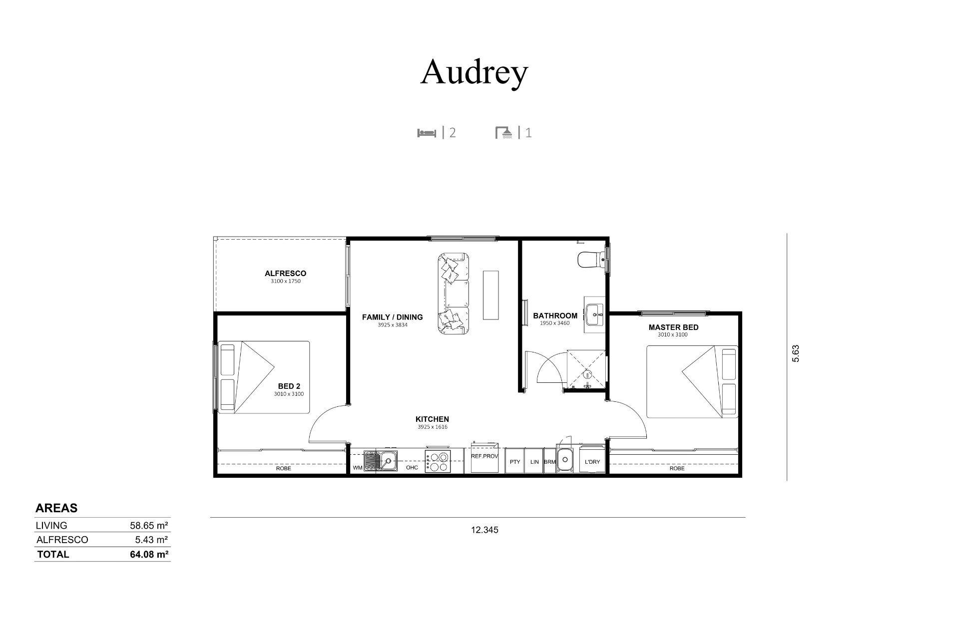 This beautifully considered 64m2 GrannyFlat offers two comfortable bedrooms, one bathroom, and a layout designed for easy, connected living.