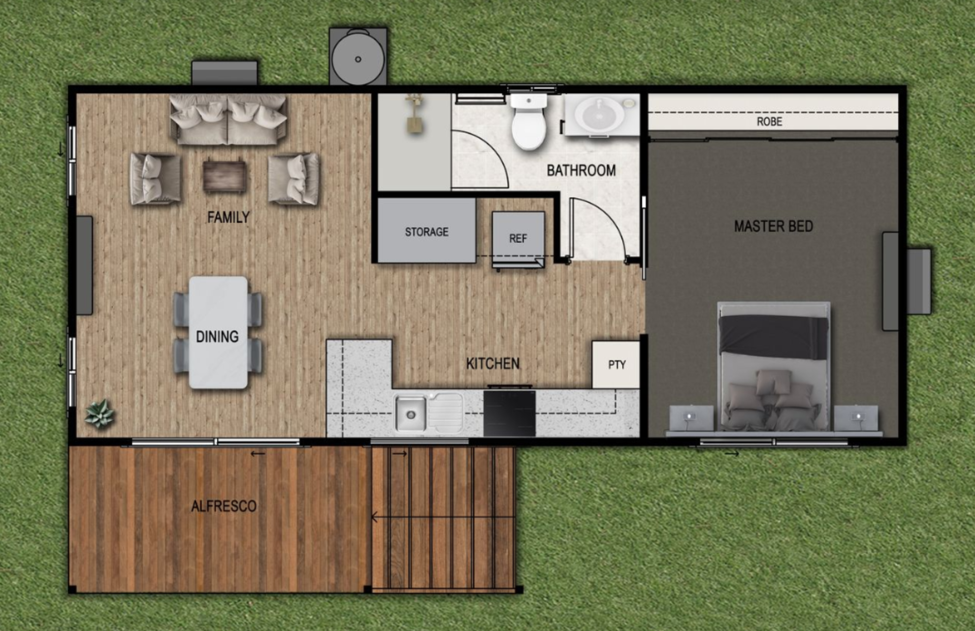 Perfect for compact spaces, this efficiently designed 50m2 Granny Flat proves that smaller doesn't mean compromising on comfort. Featuring one generous bedroom, one bathroom, and thoughtfully appointed storage solutions throughout, the open-plan kitchen and living areas create a seamless flow that maximises space and natural light.