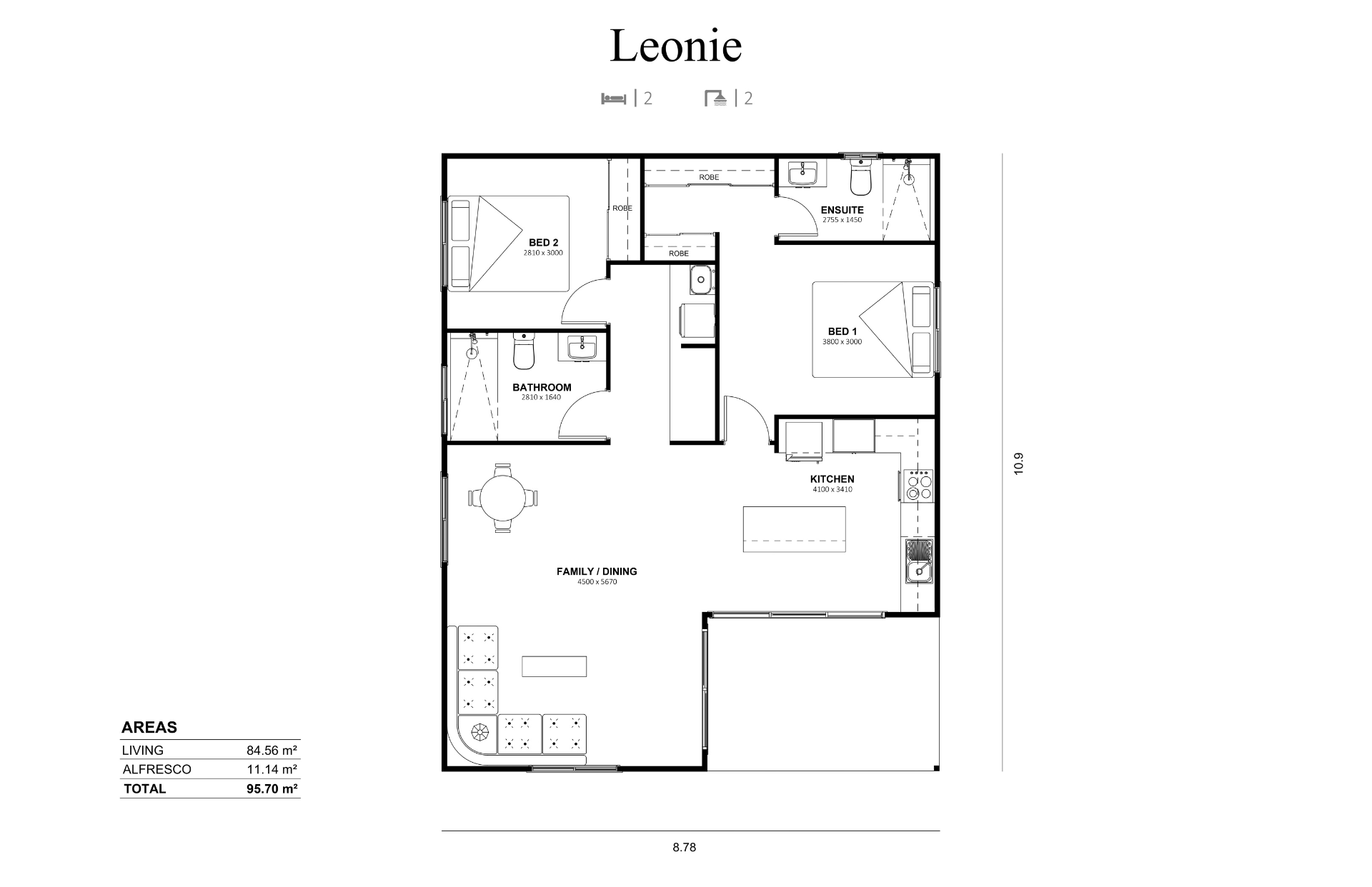 The Leonie is a spacious two-bedroom design, offering 85m2 of thoughtfully planned living across a smart, functional layout.