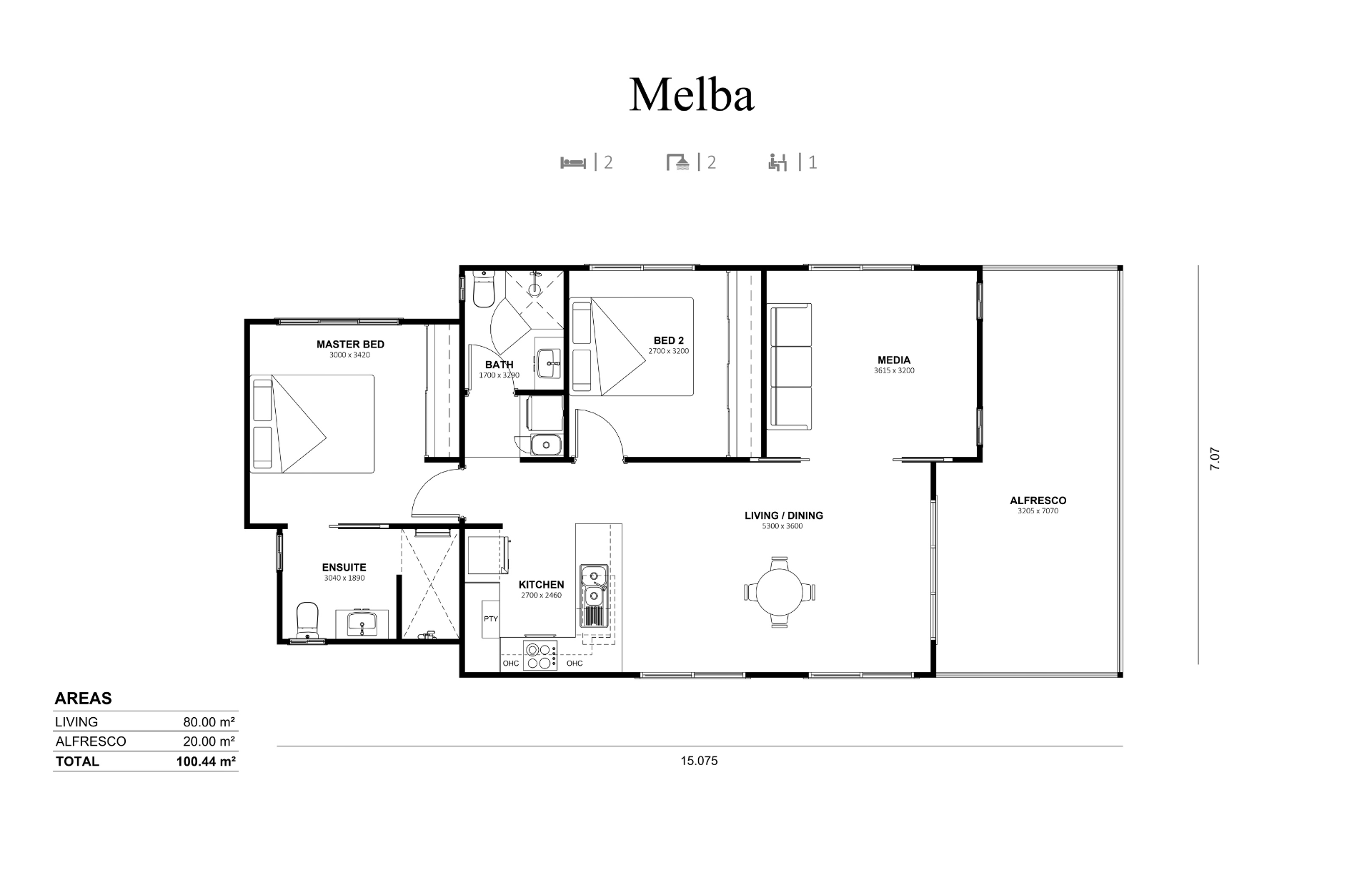 The Melba is one of our most impressive designs. Sitting as a generous 80m2 Granny Flat that offers two bedrooms, two bathrooms, a dedicated media room, and a sweeping 20m2 alfresco, it truly sets it apart.
