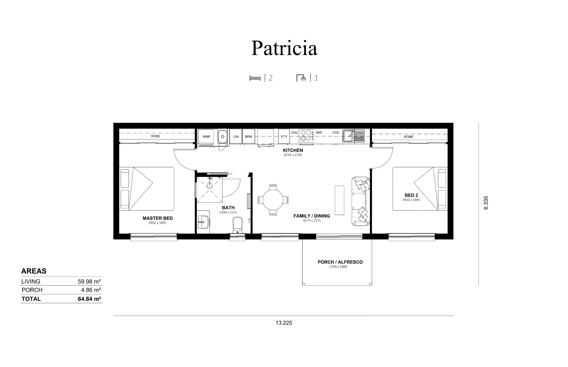 This well-appointed 64m2 GrannyFlat offers two comfortable bedrooms, one bathroom, and a smartly considered layout that puts liveability first.