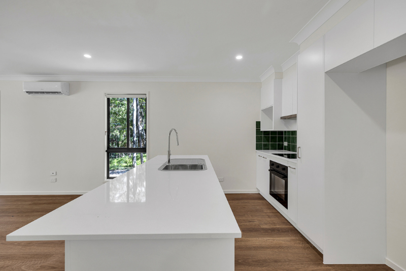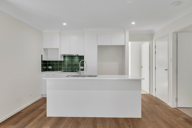 At 72m2 internally, the layout makes clever use of every square metre. The heart of the home is the open-plan kitchen and living area. Warm timber-look flooring, a generous stone island benchtop, full-height cabinetry, and a striking green tile splashback that adds personality without overwhelming the space. Large windows frame the surrounding bushland, flooding the room with natural light.