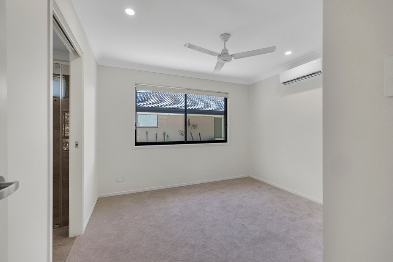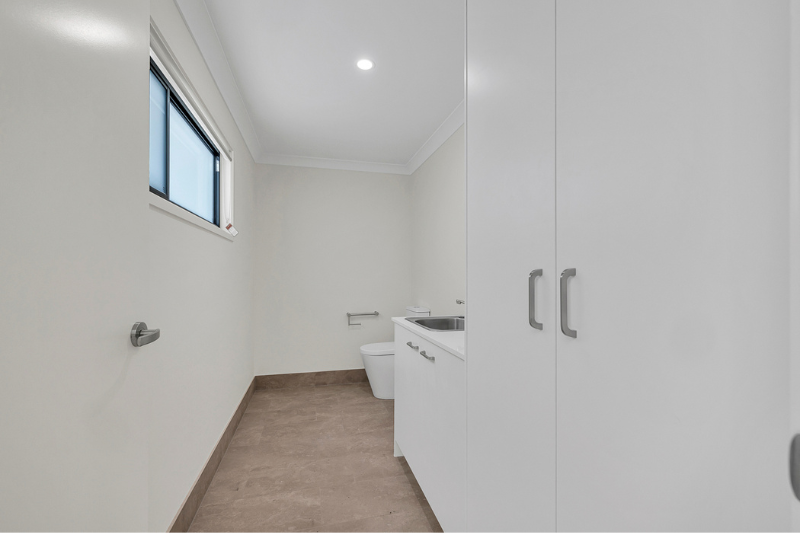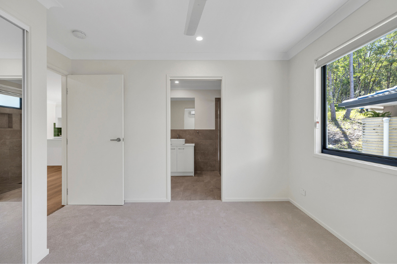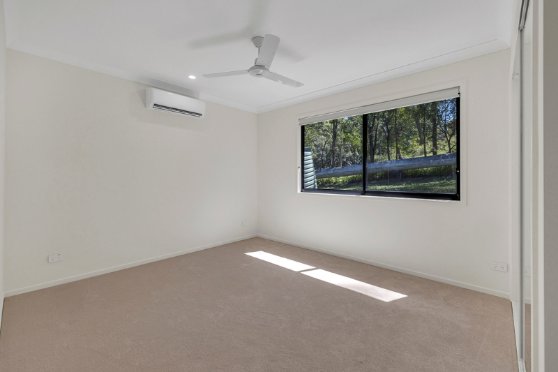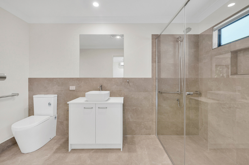 Both bedrooms are thoughtfully designed. The main bedroom features plush carpet, direct access to the main bathroom, a ceiling fan, and split-system air conditioning. The second bedroom is also carpeted and serene, with bush views and the same creature comforts. The main bathroom impresses with large-format stone-look floor-to-ceiling tiles, a frameless glass shower, vessel basin, and a clean, contemporary feel. The separate WC and laundry combo keeps the practical side of life well-organised without sacrificing any of the main bathroom's style.